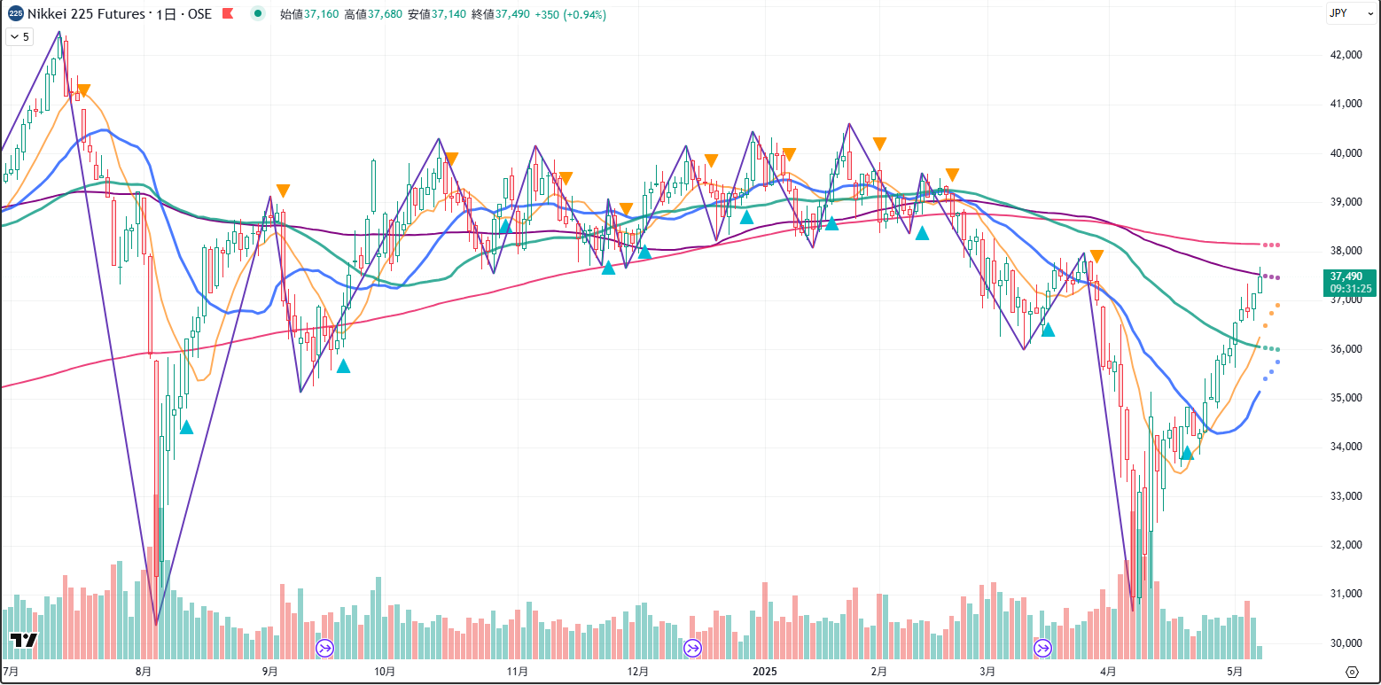 ただチャート形状を見ると天井圏でダブルトップを形成しているために仮に50MAから切り返しても下落してくる20MAあたりまでで再下落との流れも想定できる