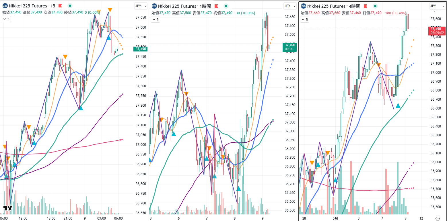 ナイト引け時点でのチャートは4時間足、1時間足と強い上昇トレンドに戻っているが15分足での調整局面