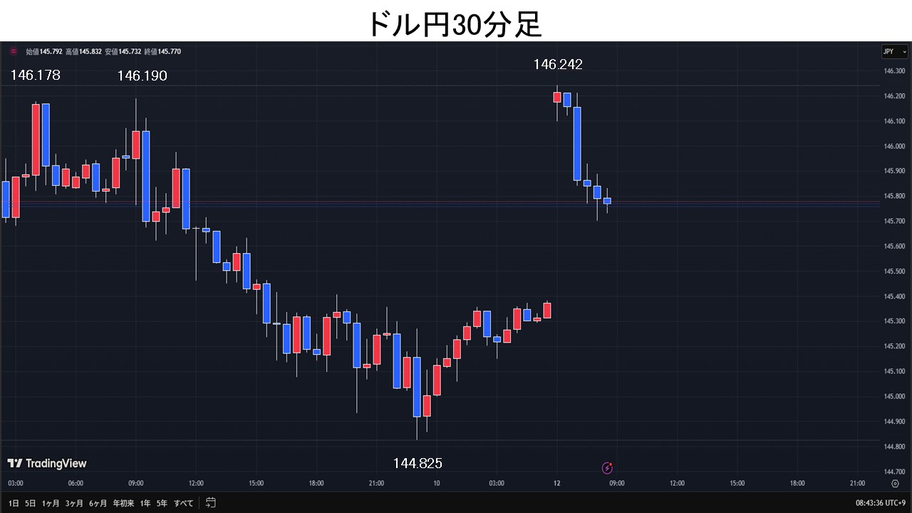 東京時間、ドル円は日経平均の上昇を受け、前日高値146.17円を上抜け146.19円まで上昇。その後は伸び悩み145.34円まで失速。欧州時間、トランプ米大統領が「中国に対しては80%の関税が適切」などと発言すると、ドル円は144.82円まで下落。NY時間、ドル円は、米10年債利回りの上昇などを受け145.38円まで買い戻された。