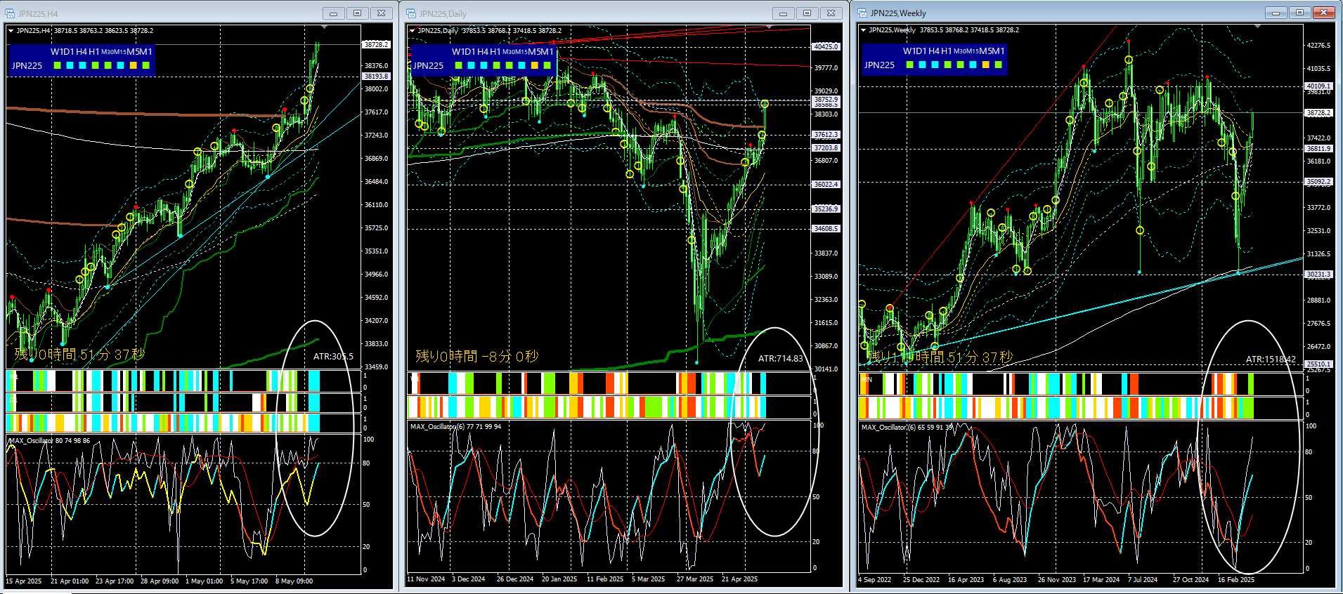 一方で、週足のMAXオシレーター、シンクロバンドは「弱い上昇」へ変化