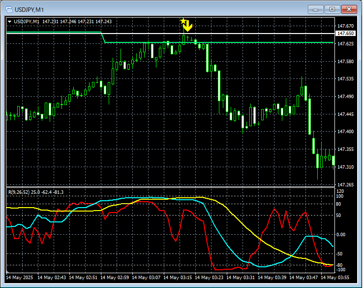 ドル円【mBDSR(RCI2本フィルター)で勝つ!!】移動平均線とネックラインと戻り売りサイン 本日午前中のチャートから 2025/5/14