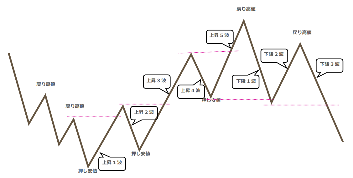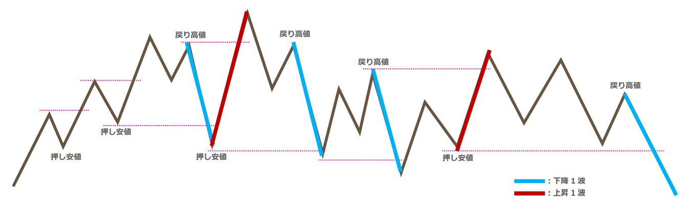「戻り高値」を上抜けたら「上昇1波」とし、「押し安値」を下抜けたら「下降1波」とします。