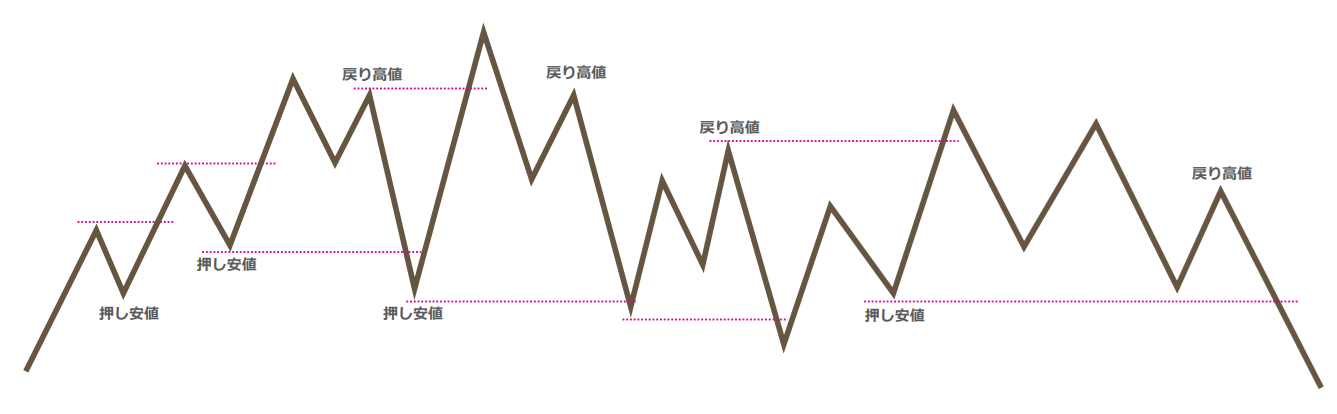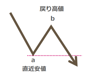 直近安値を更新した安値の起点となった高値のことを言います。また、押し安値を下抜けたらその起点となる高値を戻り高値と言います。