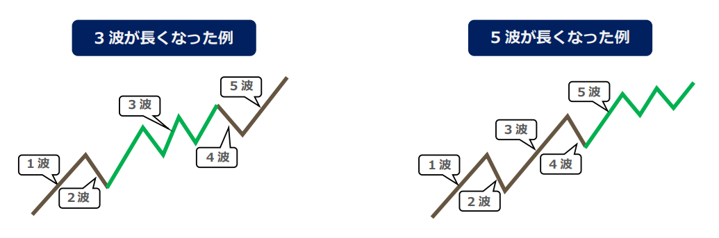 チャートで確認してみると、エリオット波動に近いものの、パターンが崩れているように見えたり、波の数が違っていたりする場合があります。これらはエリオット波動の変形型で、「エクステンション」と呼ばれます。エクステンションの例で多いのは、第3波や第5波が長くなるケースです。