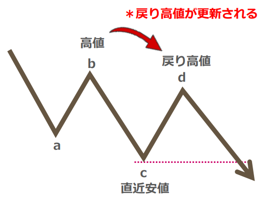 相場が更に下降し、直近安値(c)のラインを下抜けたので、このタイミングでZigZag高値(d)が新たな戻り高値となり、bは高値となります。