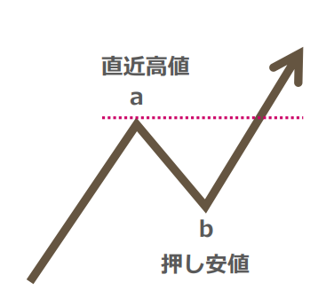 直近高値(a)のラインを上抜けたタイミングでその起点となったZigZag安値(b)が押し安値となります。