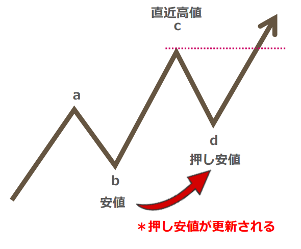 相場が更に上昇し、直近高値(c)のラインを上抜けたので、このタイミングでZigZag安値(d)が新たな押し安値となり、bは安値となります。