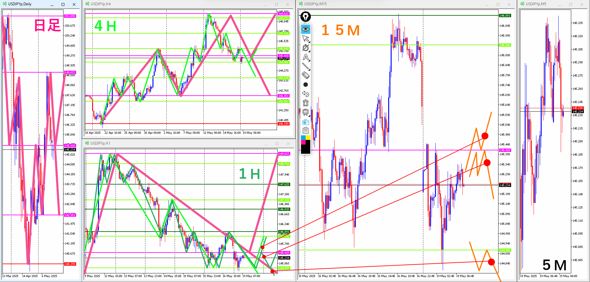 売りに優位性があり、145.410をこえるまでは売りと見切り、戻り売りを狙っていきたい。