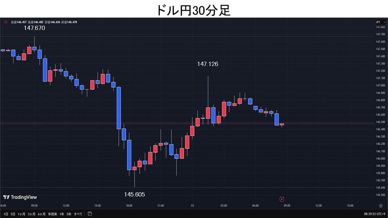 東京時間、ドル円は、一時147.67円まで上昇となるが、仲値にかけて本邦実需のドル売り観測や、日経平均の軟調などを受け146.84円まで下落。欧州時間、韓国政府当局者による、「同国の企画財政省次官が米財務省のロバート・カプロス次官補と5日に会談し、ウォン相場について協議した」との報道を受け、日米交渉で円安是正議論があるのではないかとの思惑が先行し、ドル円は145.60円まで下落。NY時間、「米政府は貿易交渉の一部としてドル安を模索してはいない」との一部報道が伝わると、ドル円は147.12円まで買い戻された。