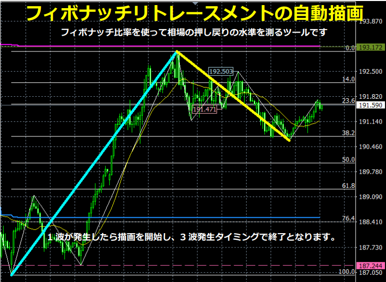 下図がフィボナッチリトレースメントの自動描画例で、上昇1波が発生したら描画を開始し、上昇3波発生のタイミングで終了します。