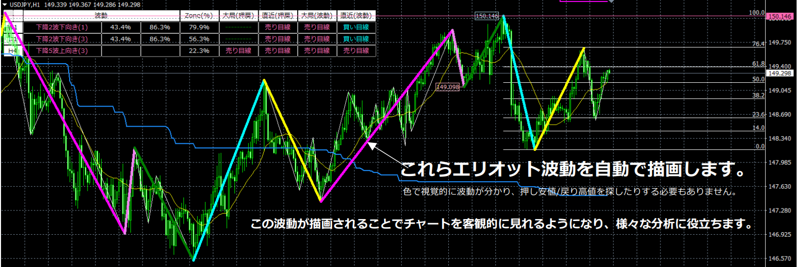 私たちが開発したZone_Elliottは、後付けではなくリアルに自動でエリオット波動を描くことができるツールです。