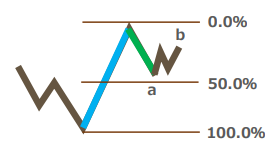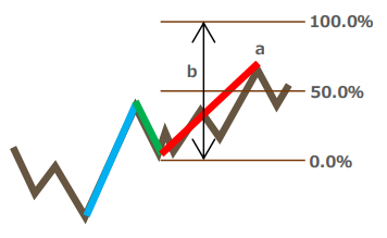 上図の場合、上昇2波上向き(2) 23.8% 49.3%と表記されます。左側の23.8%(b)が現在値で、右側が最大戻り率(a)になります。要約すると、上昇1波に対して最大で49.3%(a)まで戻り、現在は23.8%(b)まで戻ってきている状態となります。