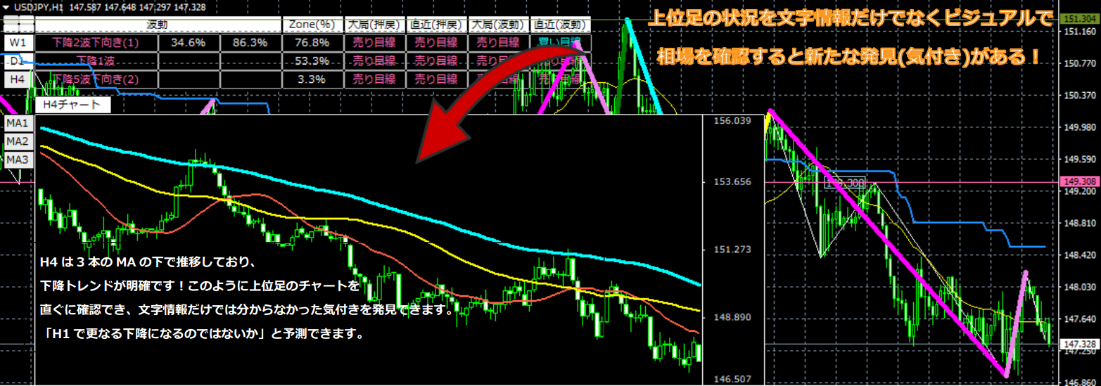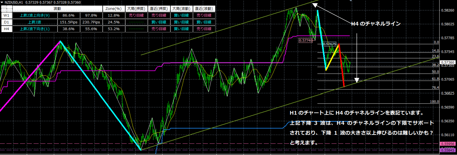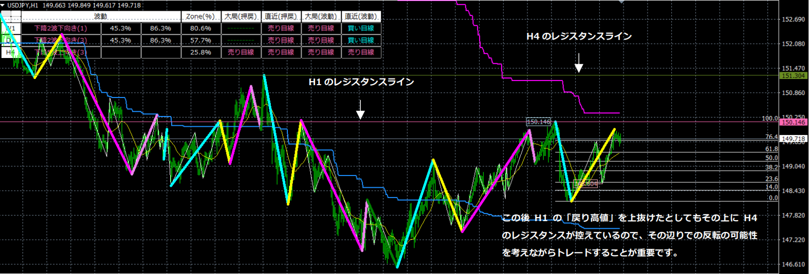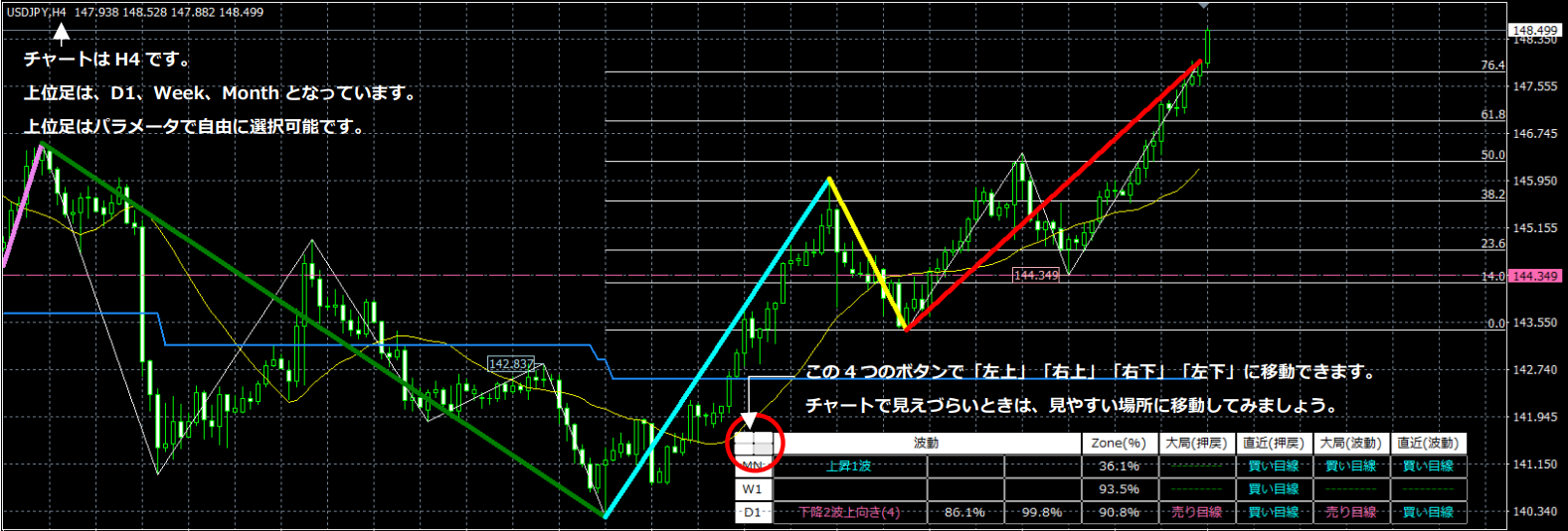 これにより、大きく伸びる3波になるケースの割合は増えましたが、100%ではありません。そこで、「どの3波が大きく伸びる可能性が高いのか」を判別できるような機能を1つのチャート上に集結させ、正しい判断ができるツールとして誕生したのがZone_Elliottになります。