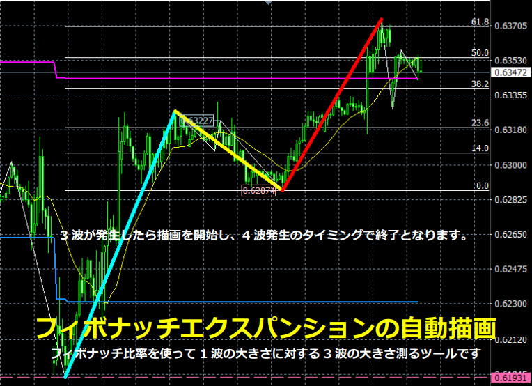 次の図がフィボナッチエクスパンションの自動描画例で、上昇3波が発生したら描画を開始し、上昇4波発生のタイミングで終了します。