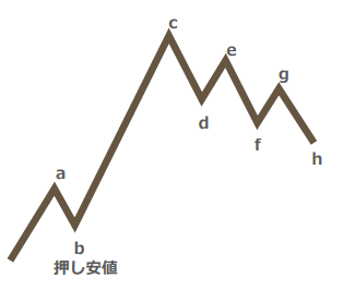 Zone_Elliottでは、dを下抜けたタイミングでeが「直近の戻り高値」となり、更にfを下抜けたタイミングで更新され、gが「直近の戻り高値」となります。