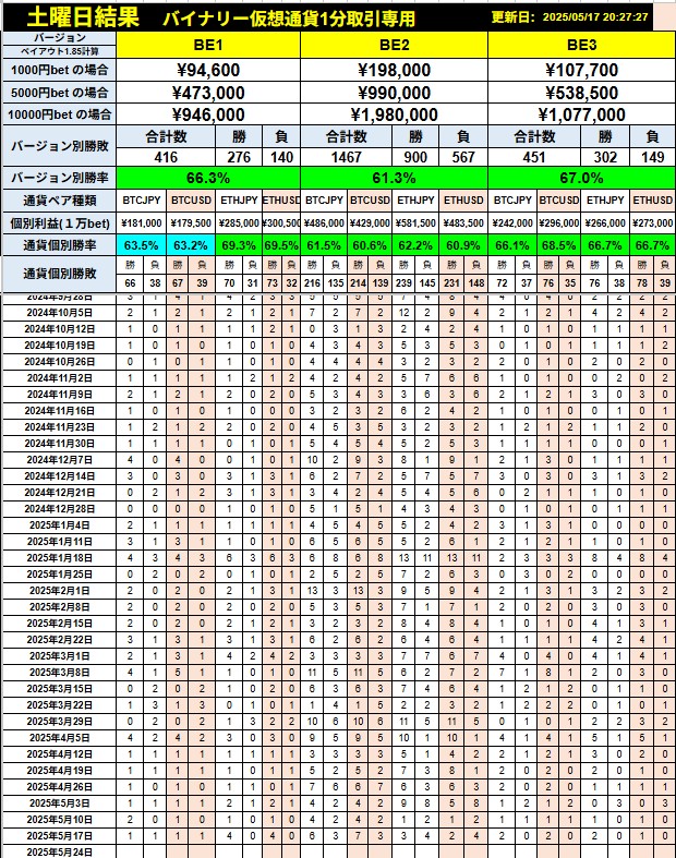 土曜日の結果について;バイナリー仮想通貨1分足判定用 オリジナルツール「BE」