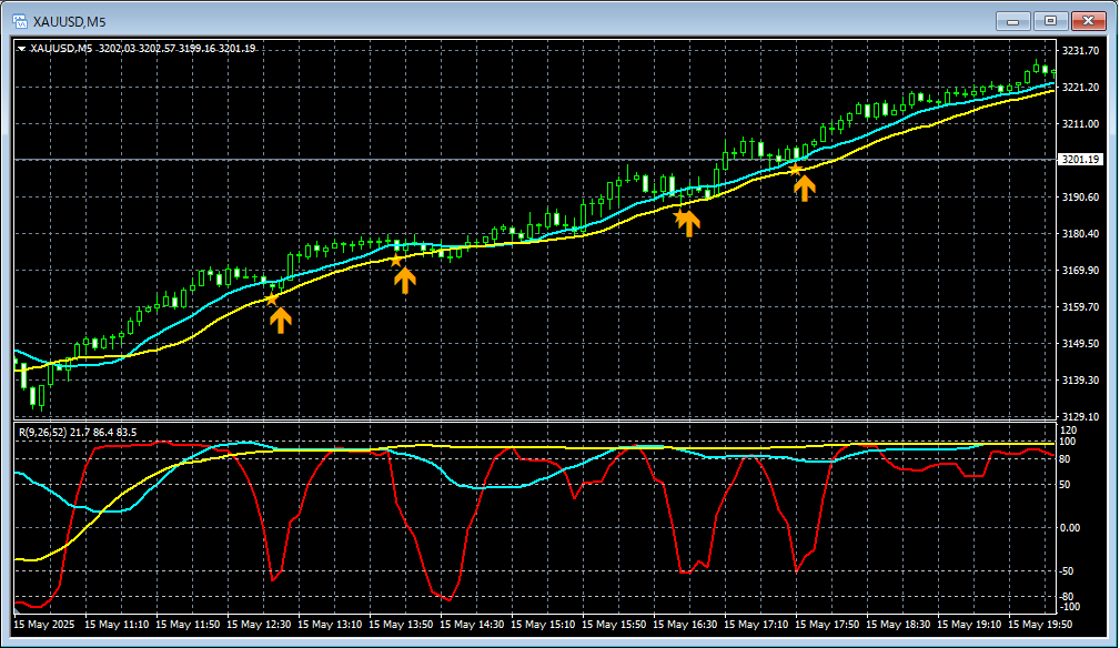 【RCIを極めて移動平均線フィルターで勝つ!!ゴールド XAUUSD 20250515】連続するmBDSRの押し目買いサイン