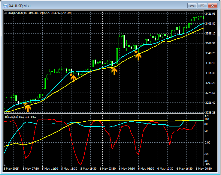 上の30分足では、mBDSR(移動平均線フィルター)の押し目買いサインがタイミングよく点灯している。