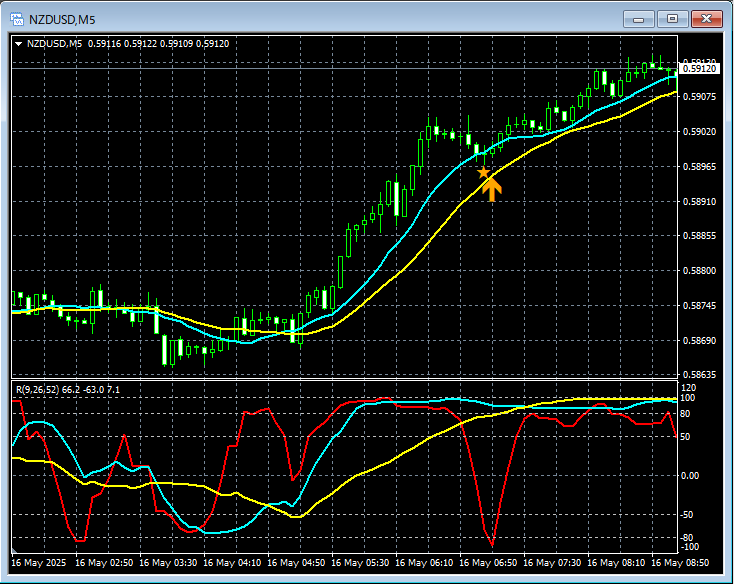 上の5分足では、mBDSR(移動平均線フィルター)の押し目買いサインがタイミングよく点灯している。