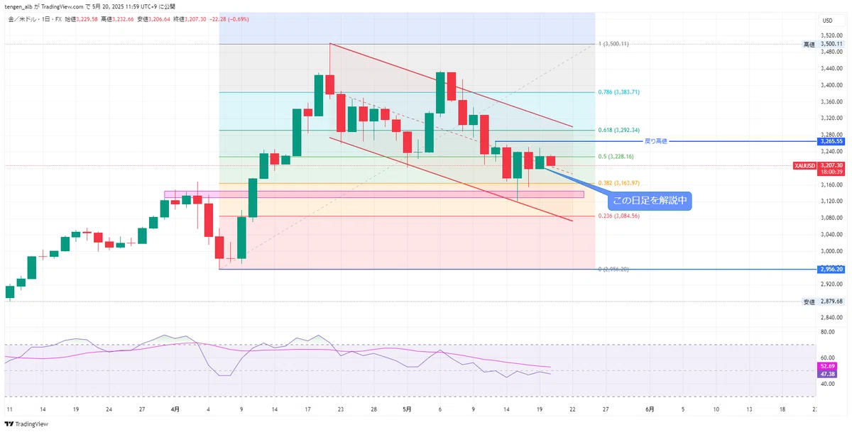 今回は昨日5月19日のGOLD(XAU/USD)の日足をもとに、