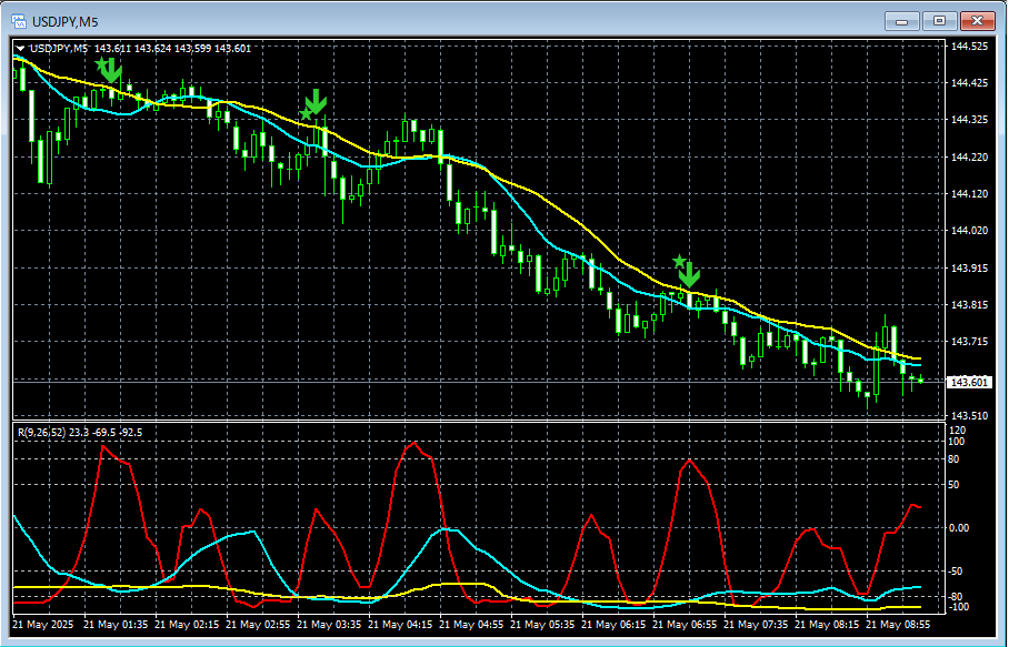 上の5分足では、mBDSR(移動平均線フィルター)の戻り売りサインがタイミングよく点灯している。