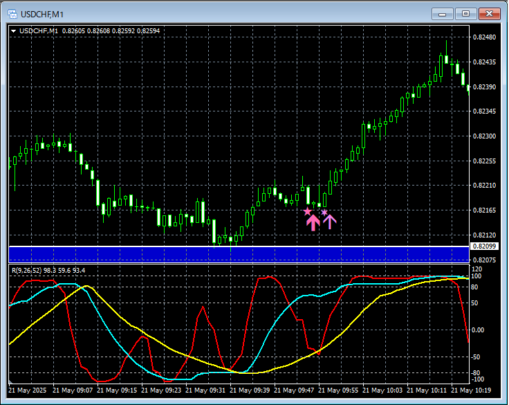 上の1分足では、mBDSR(RCI2本フィルター)のサインが点灯した後にR1R2S2のサインが点灯している。