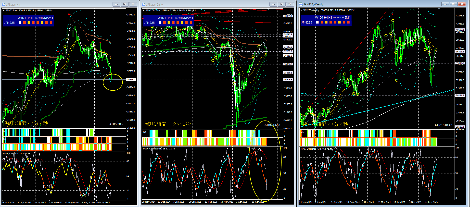 日足のMAXオシレーター・シンクロバンド共に下落基調を示す
