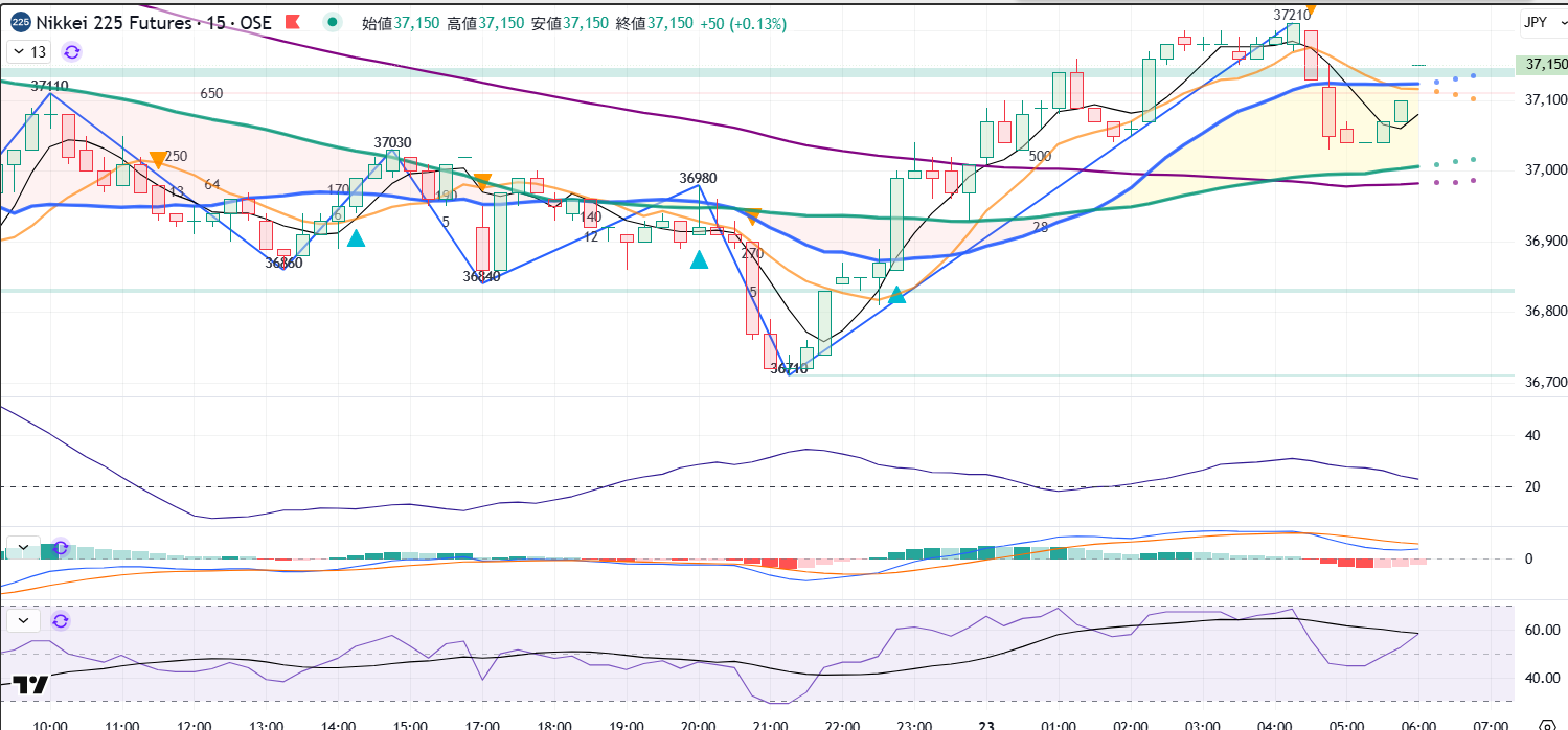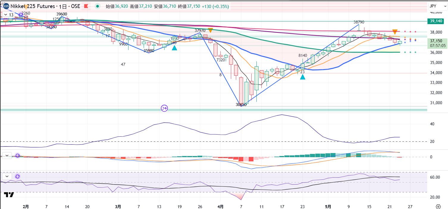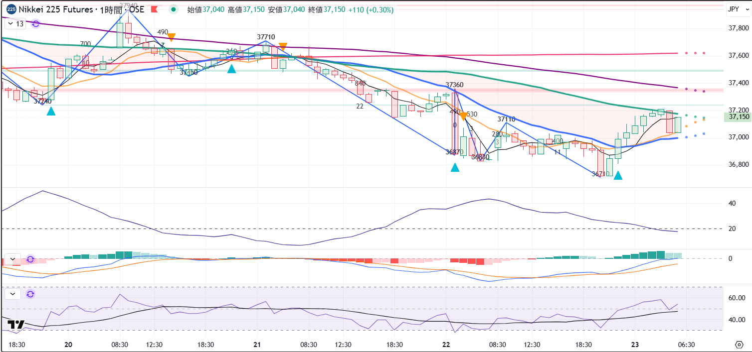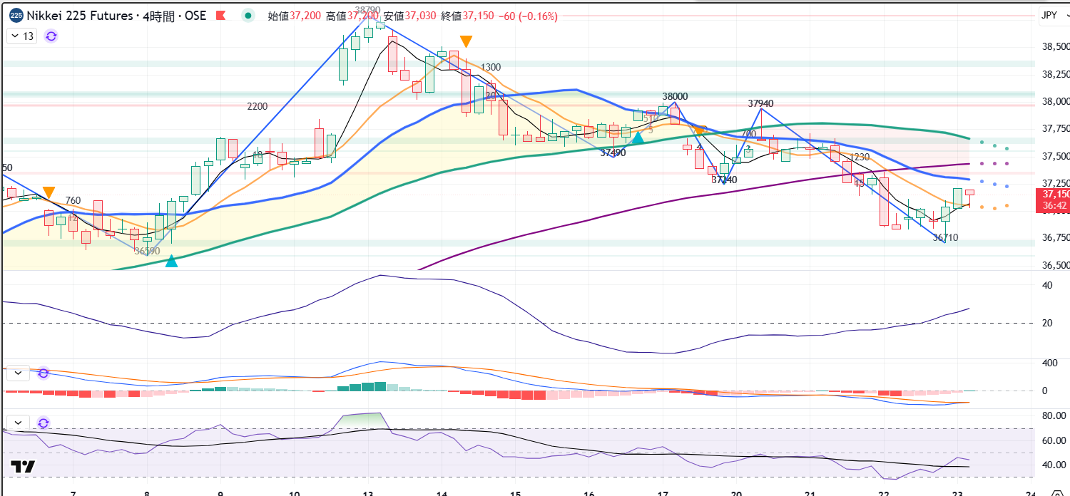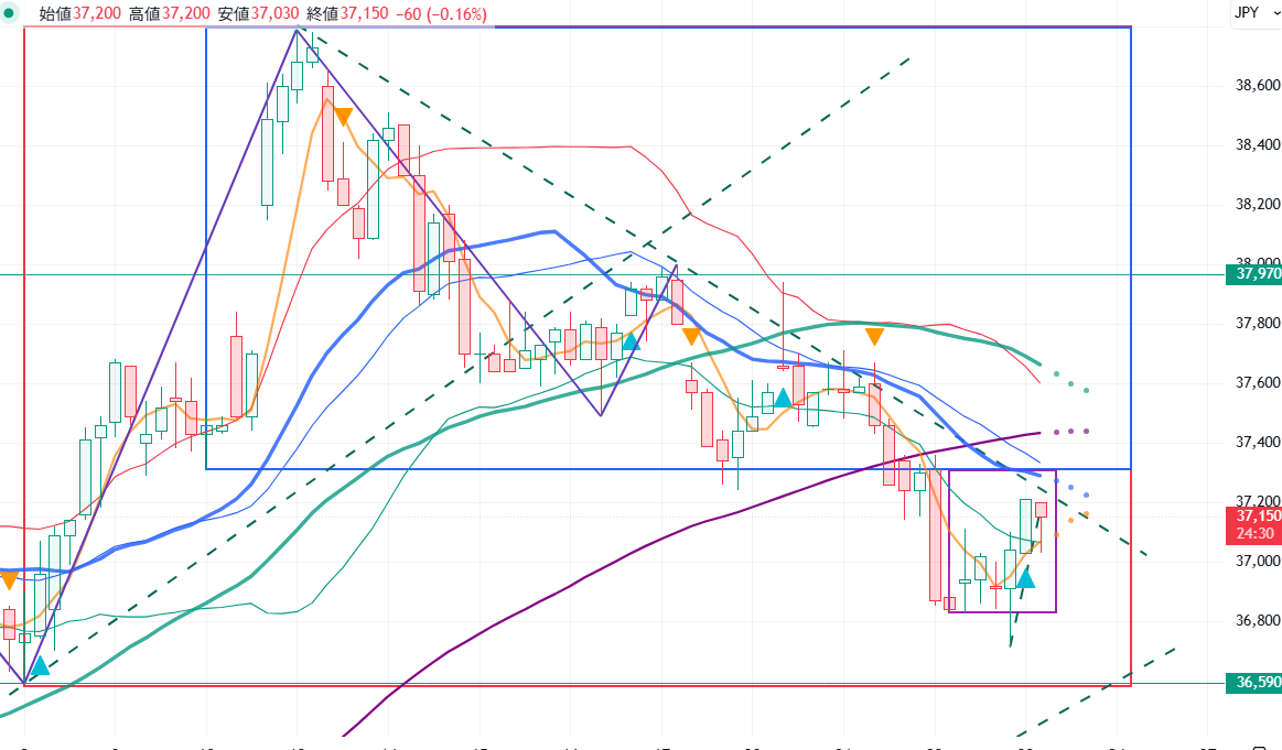 1時間足ベースでのレンジ青枠エリア下限が大きな抵抗としてあるために(37300近辺)ここを抜けてくるには材料が必要