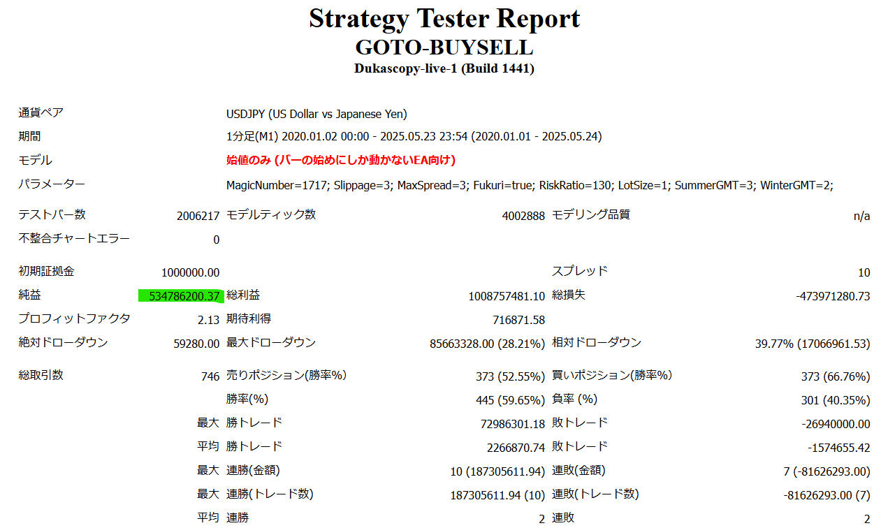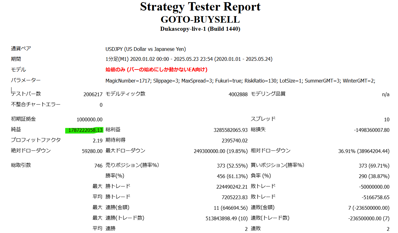 以下に「GOTO-BUYSELL(ゴトー日EA)」のバックテスト結果を並べてみますね。