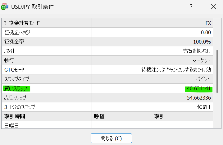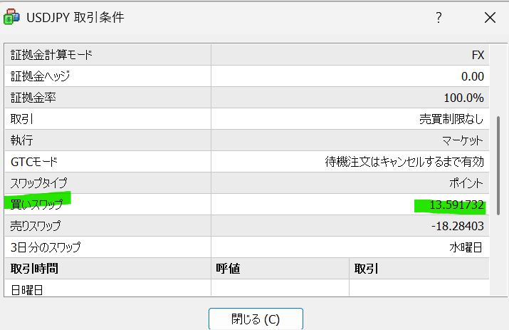通貨ペアのプロパティは以下のとおりで、左が通常時、右が3倍デー。
