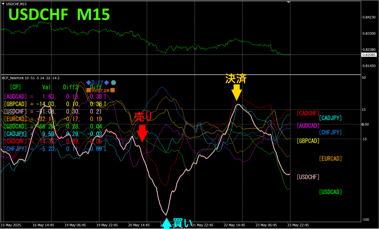 上半分は、USDCHFの15分足チャートです。下半分は、「8CP見える化インジケータ」によるものです、ピンク色太線のグラフがUSDCHFに相当します。