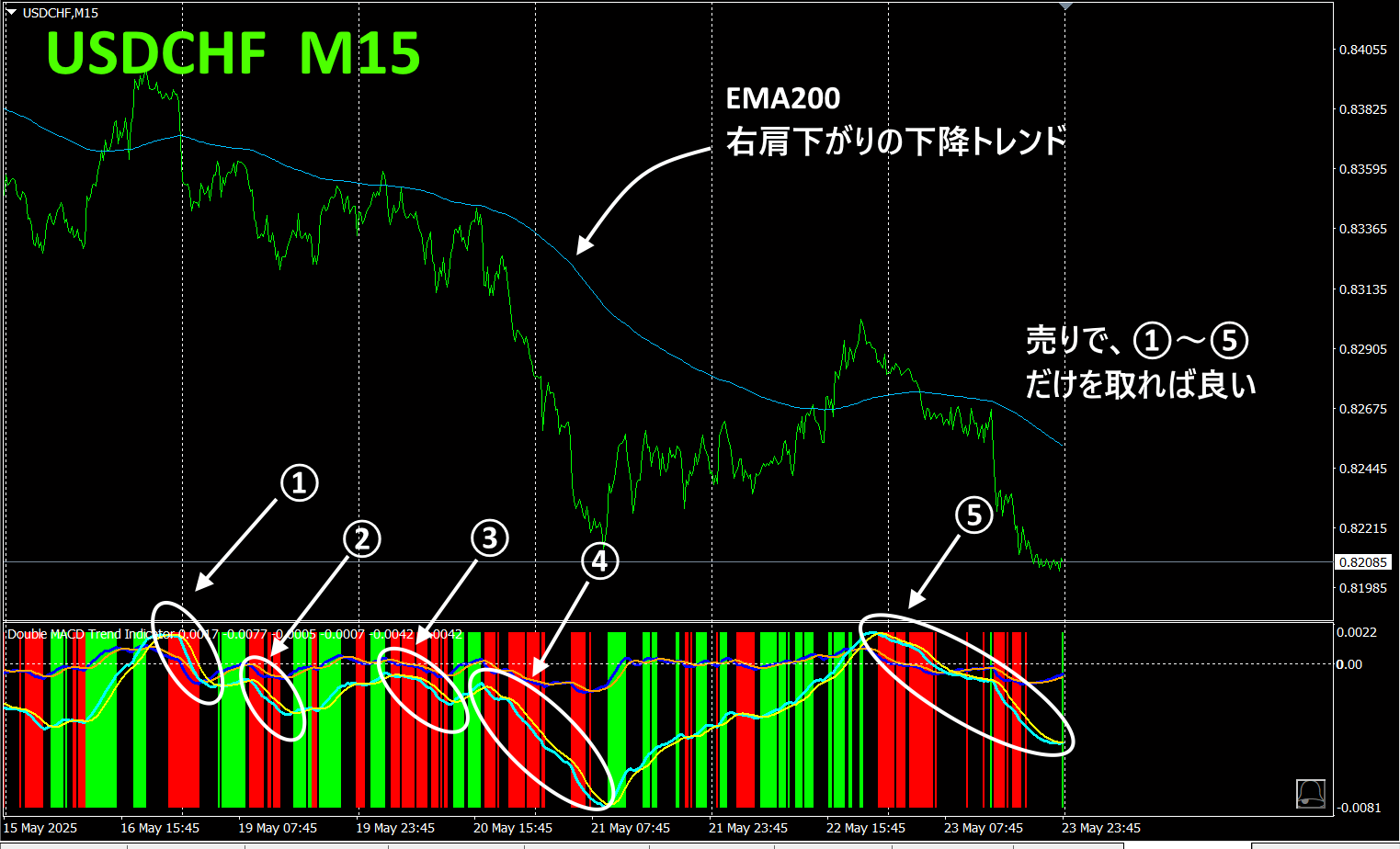 移動平均線(EMA200)を入れています。右肩下がりの下降トレンド状態になっているので、トレードは、「売り」だけを考えれば良いです。狙い目は、インジケータのバーの色が赤で、長期MACDのグラフが右肩下がりになっている所です。上記の図の、①から⑤が、これに該当します。その他の場所では、「トレードをしない」ことに徹してください。