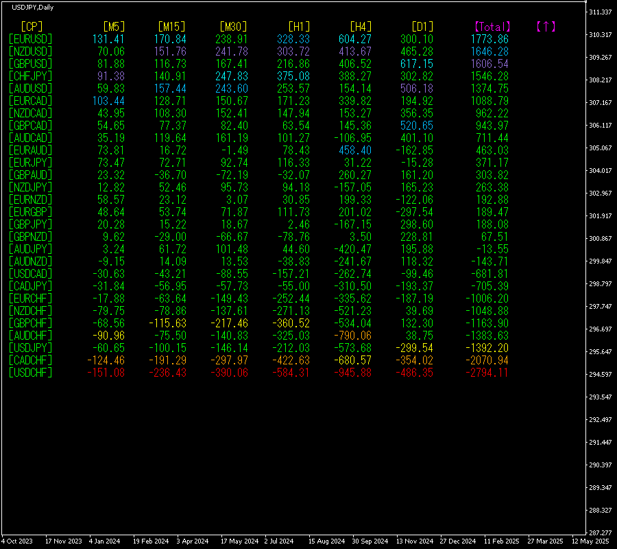 [Total]数値の降順に並んでいます。一番下にあるUSDCHFは、全ての時間足で赤色の表示色になっています。Total数値が -2794.11 と、大きなマイナスの数字になっています。全時間足で、USDCHFに下降トレンドが発生していることが明らかです。