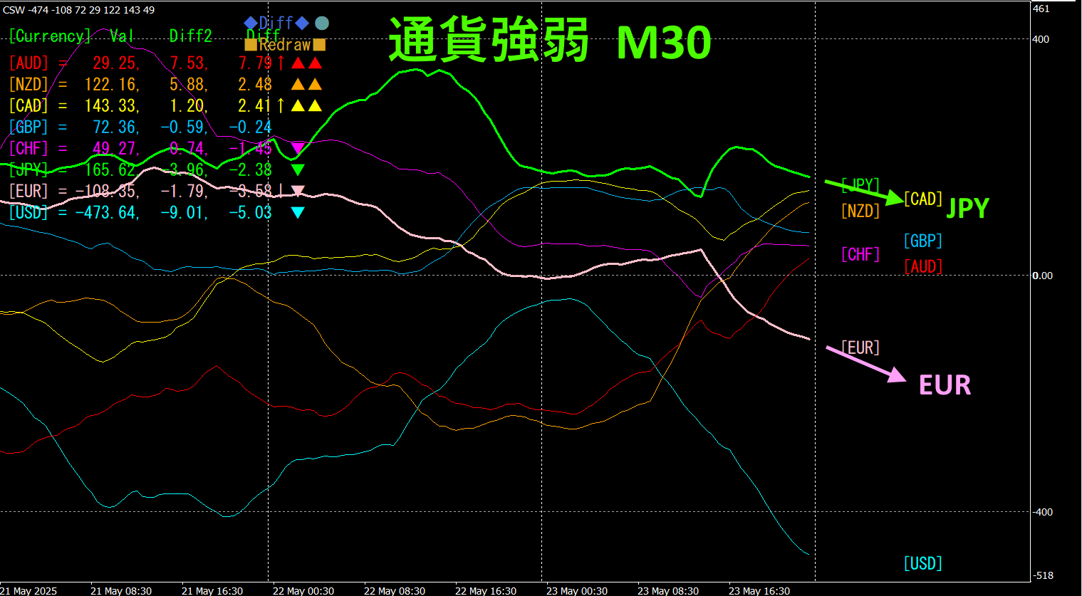 ピンク色がEUR、緑色がJPYです。通貨強弱チャートは、JPYが上向きに、EURがやや下向きになっています。従って、EURJPYは、今後も下降傾向に推移すると考えられます。
