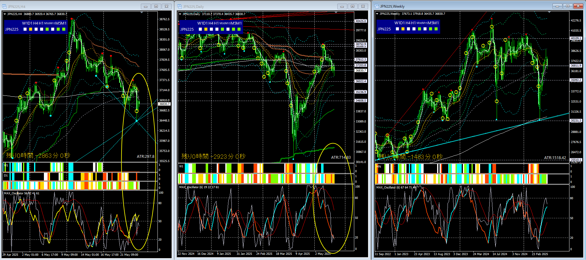 日足のMAXオシレーター・シンクロバンド共に下落基調を示すが、週足で見れば上は崩れていない。