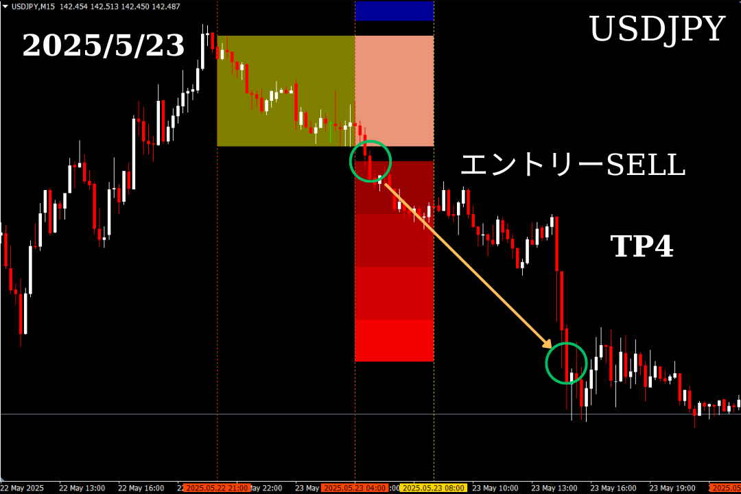 2025年5月23日のドル円は、完璧なSELLサインでTP4まで一直線という理想的な展開でした。
