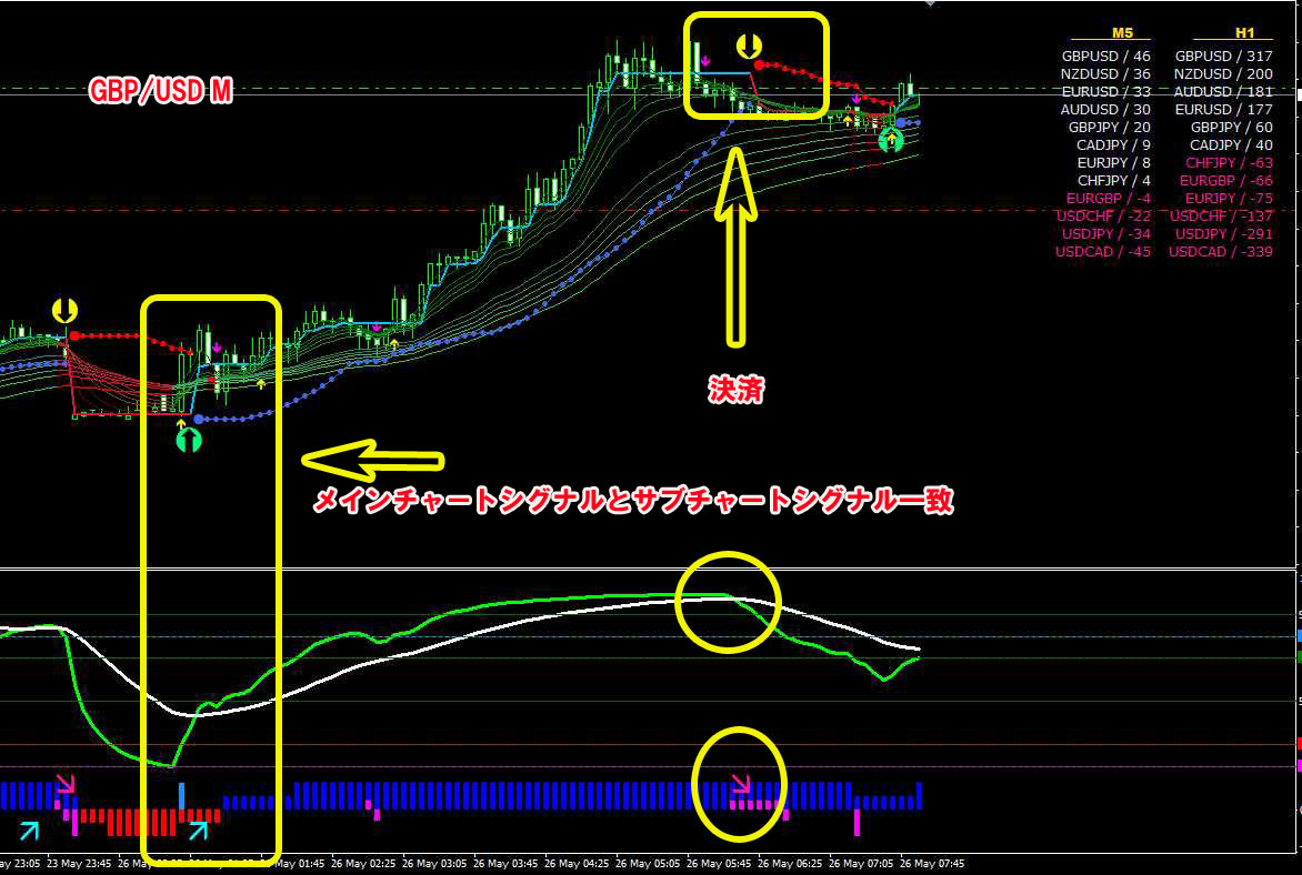 チャート図内にも説明してありますが、メインチャートとサブチャートの緑シグナルが一致したところで買いエントリー。
