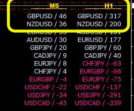 今の場合M5、H1共にGBP/USDが一番上に来ていますので、GBP/USDがハッキリとトレンドとして出ていると判断し、GBP/USDでトレードする事とします。