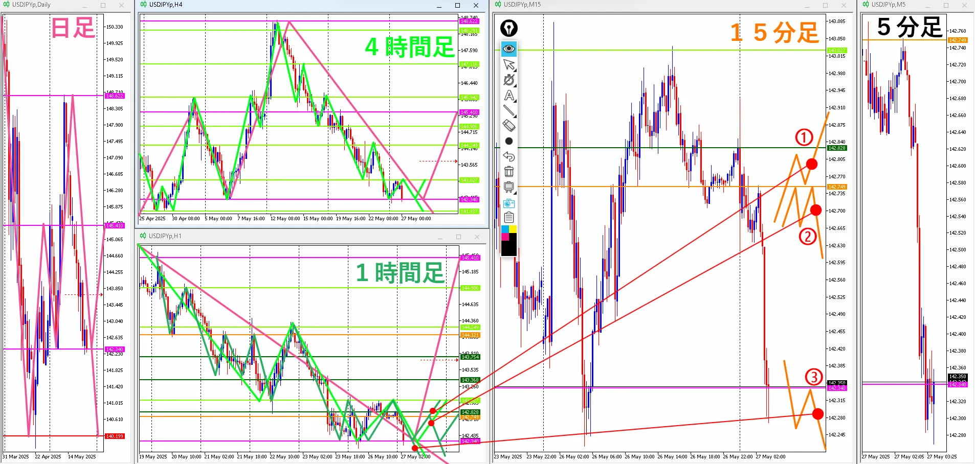 ●日足・4時間足・1時間足・15分足までの相場を水平線とダウ理論を使って環境認識し、エントリーポイントを3つに絞る。