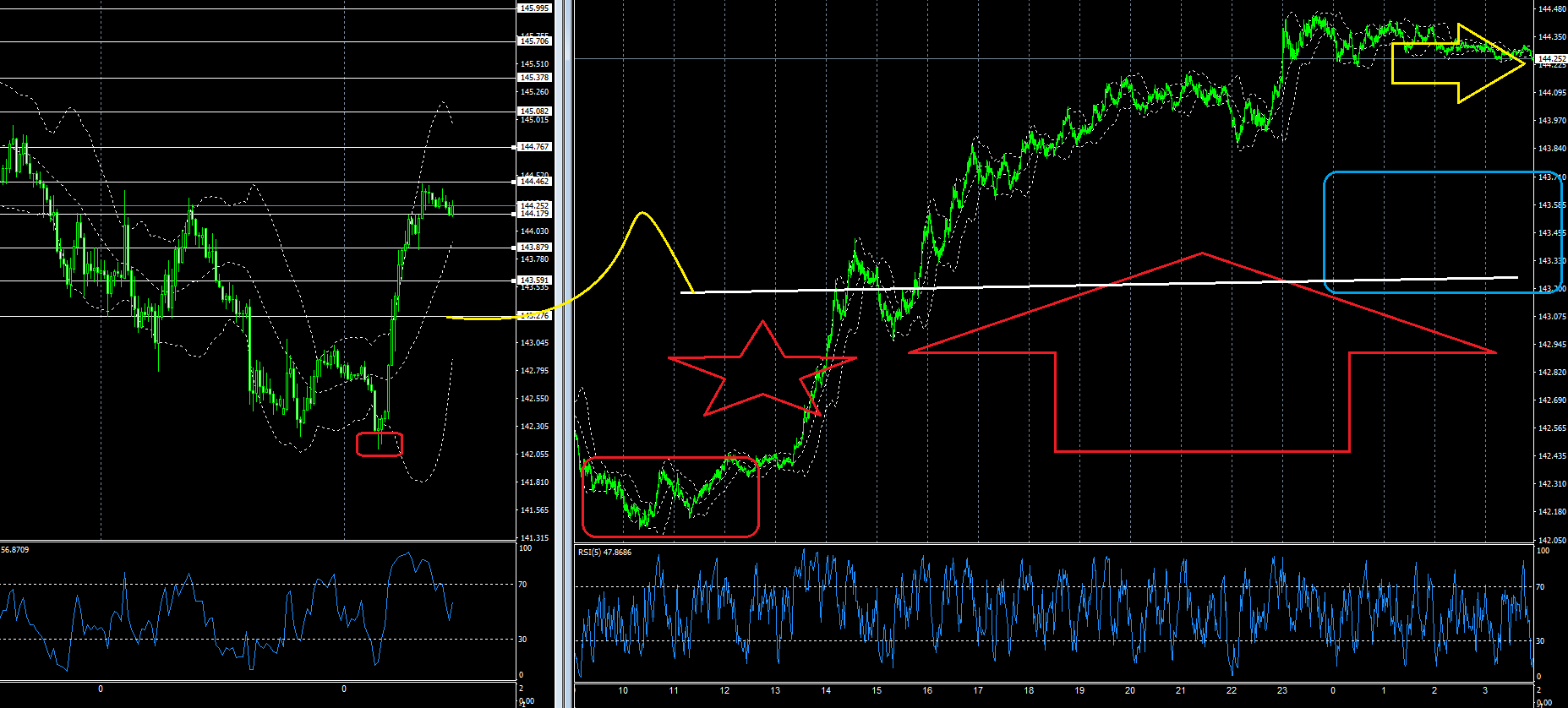 1分足を見ての通り東京仲値付近まで下落し、2時間ほどレンジになりその後急上昇と言う流れ。