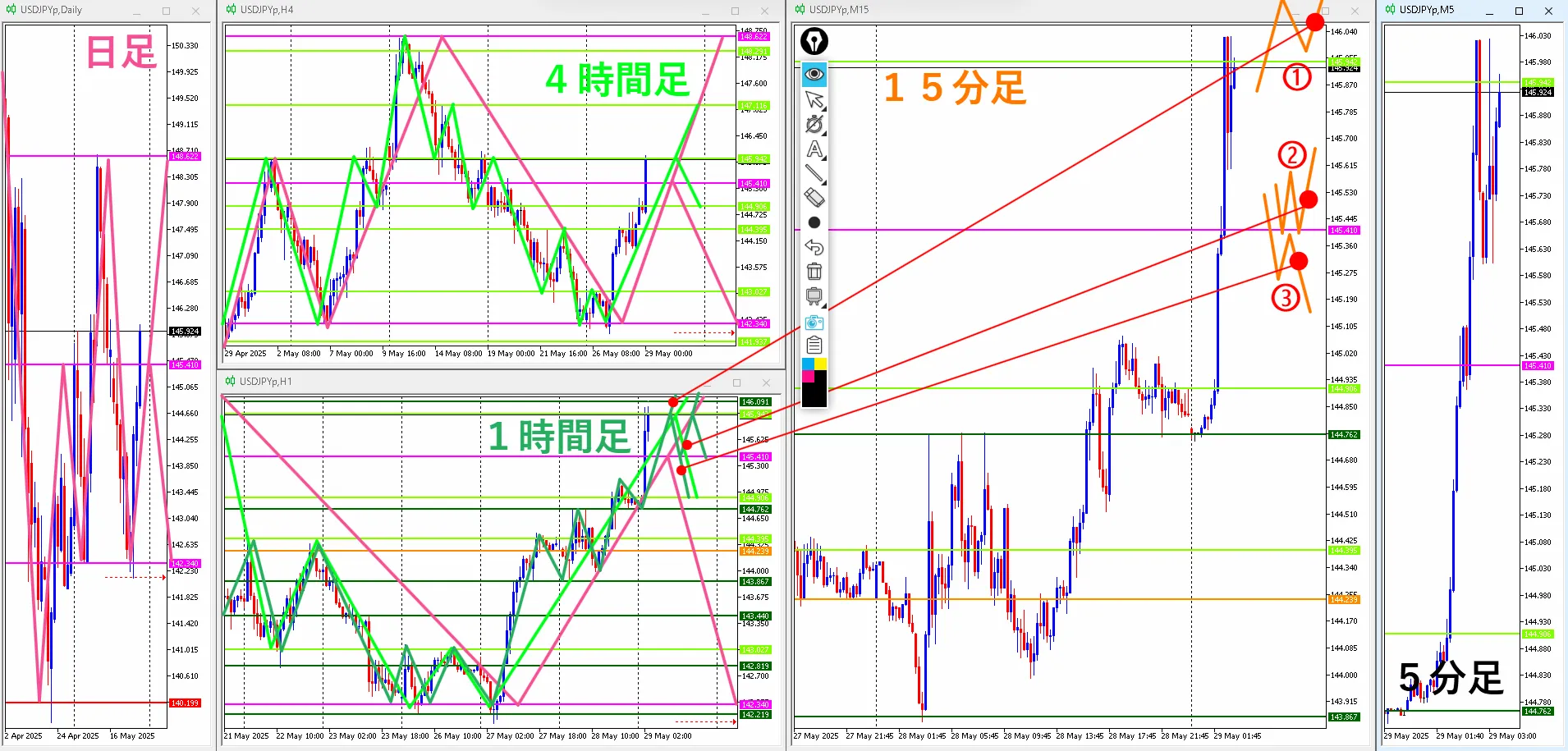 ●日足・4時間足・1時間足・15分足までの相場を水平線とダウ理論を使って環境認識し、勝率の高いエントリーポイントを3つに絞る。
