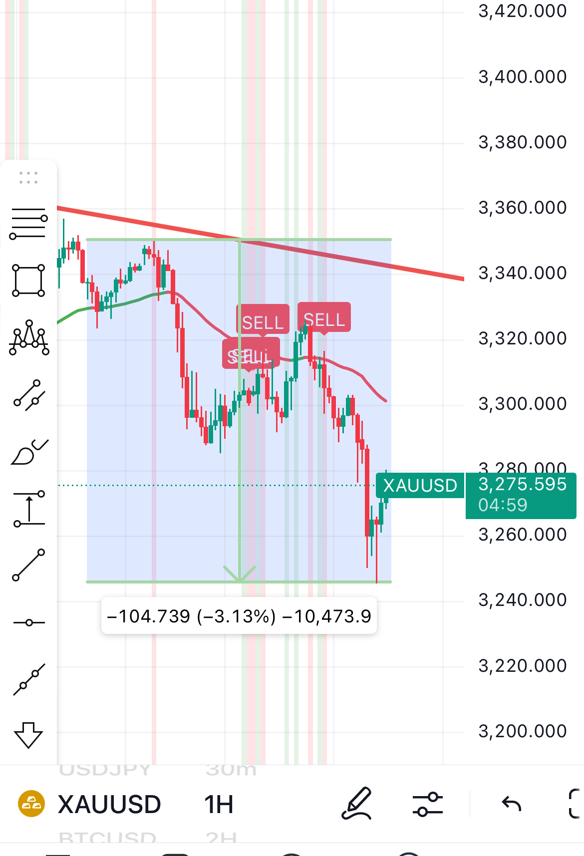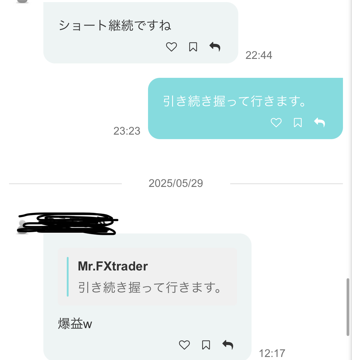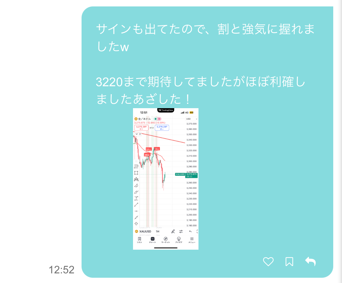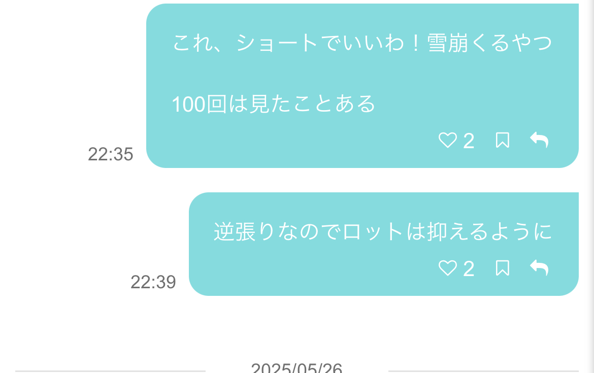 ほぼ利確し、目標までは、ストップロスを下げながら、最後を狩られるのを待ちます。順張りは最終的には損切りで終わるのが答えなので。