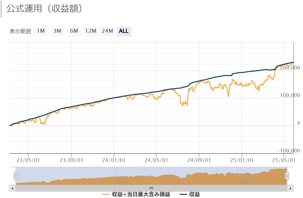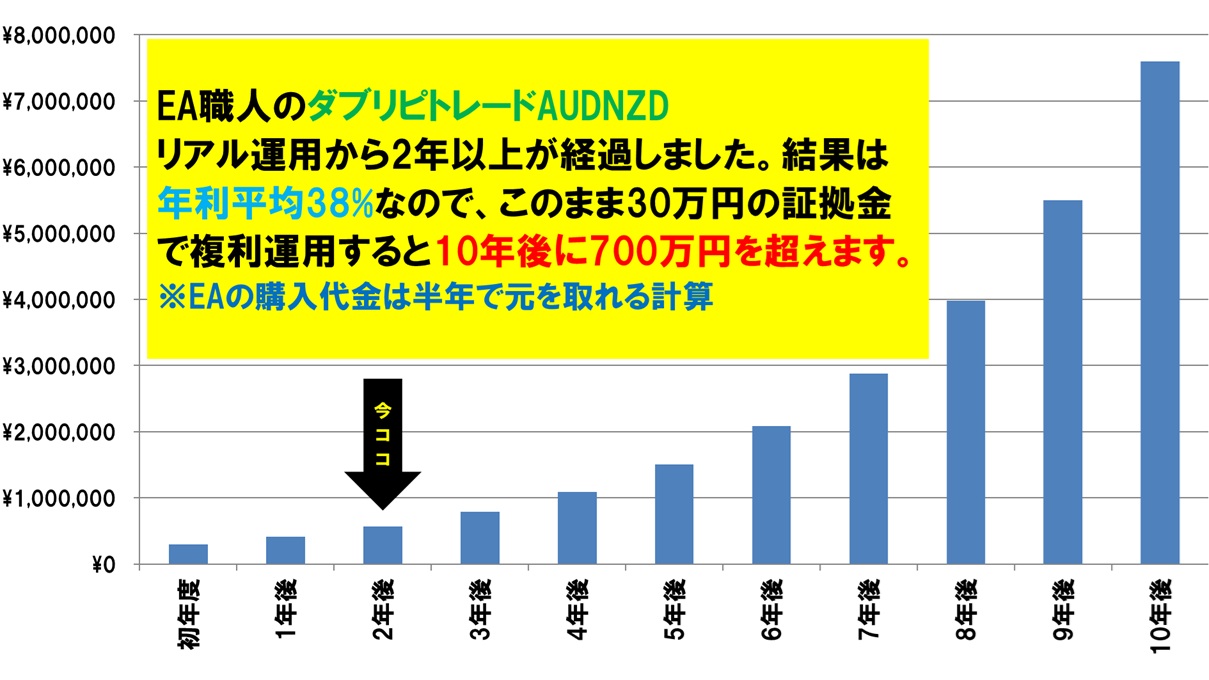 30万円の証拠金で開始し、2年で228,882円の利益という事は年利約38%という事になります。これを複利運用させると10年後には700万円を超える計算になります。