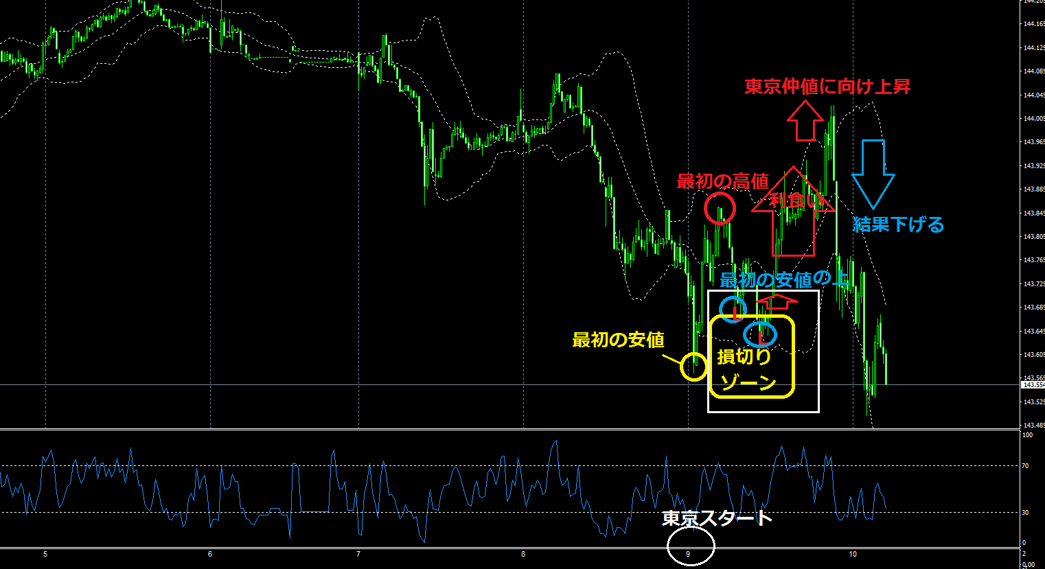 東京9時スタート前から1時間足監視し、下落トレンドなので下げたら買うと言う買い待ち。