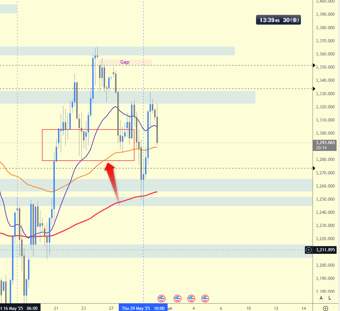 ちなみに、下図の赤枠のように価格が違うヒゲが乱立するエリアは、明確なストライクゾーンを特定できません。