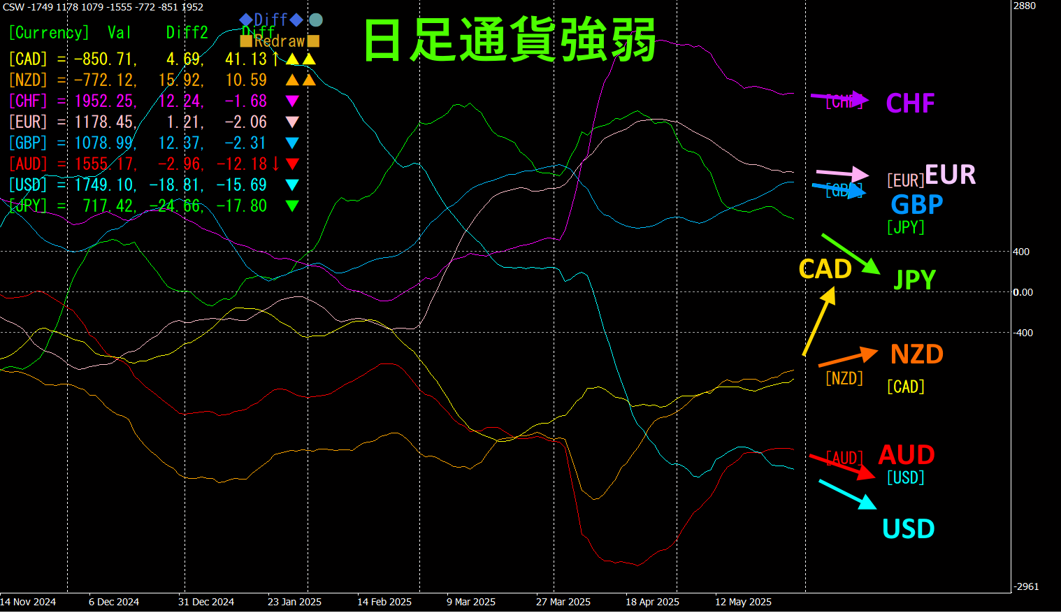 CAD、NZDが上向きです。一方、JPY、USD、AUD、GBP、EUR、CHFが下向きになっています。日足では、CADの上昇が目立っています。