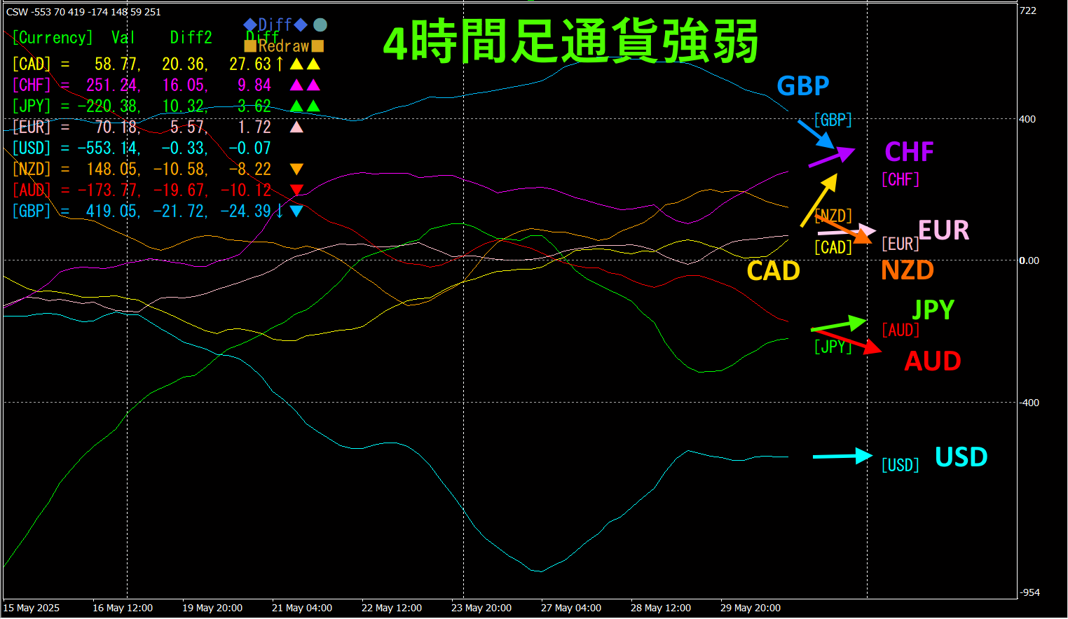 4時間足では、CAD、CHF、JPY、EURが上向きに、GBP、AUD、NZD、USD、が下向きになっています。4時間足でもCADが大きく上を向いています。