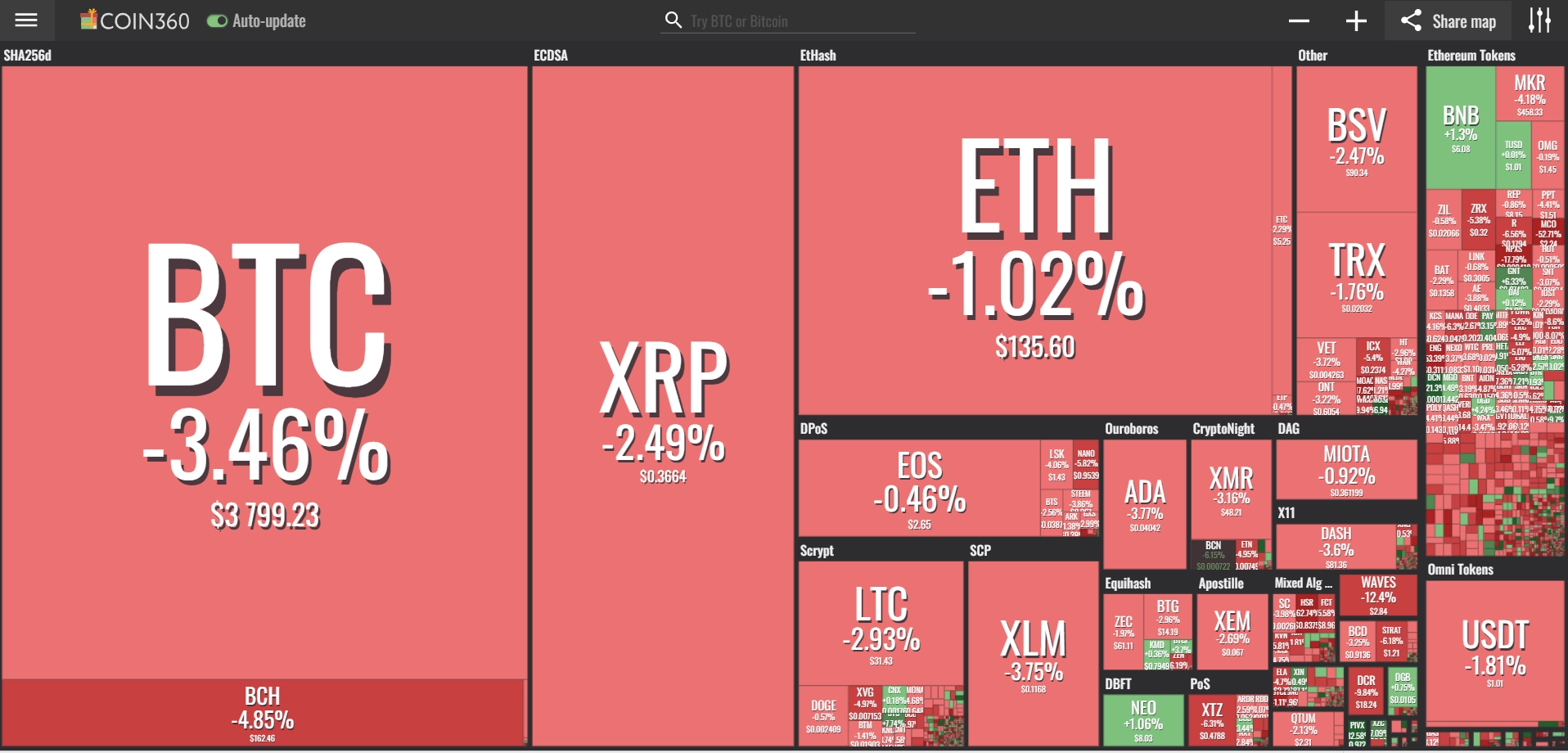 coinmarketcap(コインマーケットキャップ)のサイトから、ドミナンス(各銘柄が仮想通貨全体の時価総額に占めるパーセンテージ)を定点観測していきます。仮想通貨全般が下方向に大きく動き出している相場状況を受け、毎日更新することとし、仮想通貨業界を俯瞰および転換期を早期に発見することを目的とします。