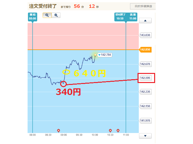 赤〇340円の時に20万円分買って黄色〇640円で売却。