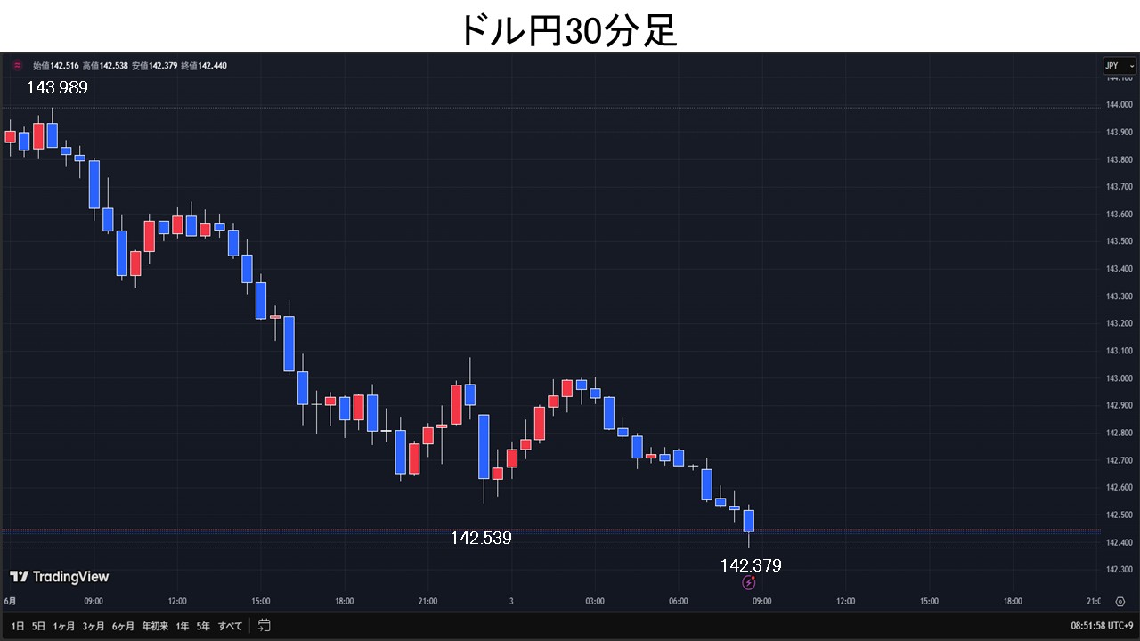 東京時間、週末にトランプ米大統領が「輸入される鉄鋼製品などに課している追加関税を2倍の50%に引き上げる」と明らかにしたほか、「中国が米国との合意に完全に違反した」と発言した事から、米中の貿易摩擦の激化懸念が高まり、ドル円は143.33円まで下落。欧州時間、欧州通貨に対するドル売りが先行し、ドル円は143円を割り込んだ。NY時間、5月米ISM製造業景況指数や4月米建設支出が予想下振れとなると、ドル売りが先行し、ドル円は142.53円まで下落。その後、急落していたNYダウ平均が上げに転じた事や、レビット米ホワイトハウス報道官が「トランプ米大統領と習・中国国家主席は今週協議する可能性が高い」と明らかにすると、ドル円は142円台後半まで買い戻されたが上値は重かった。